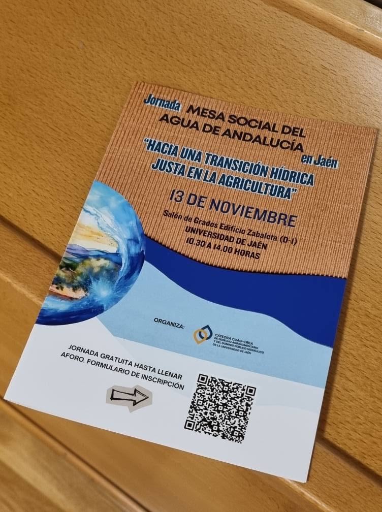 13 de noviembre de 2025.- La Cátedra Universitaria COAG-CREA de Derecho Agroalimentario y del Dominio Público Hidráulico de la Universidad de Jaén ha organizado este 13 de noviembre la Jornada de la Mesa Social del Agua de Andalucía en Jaén con el nombre “HACIA UNA TRANSICIÓN HÍDRICA JUSTA EN LA AGRICULTURA”.