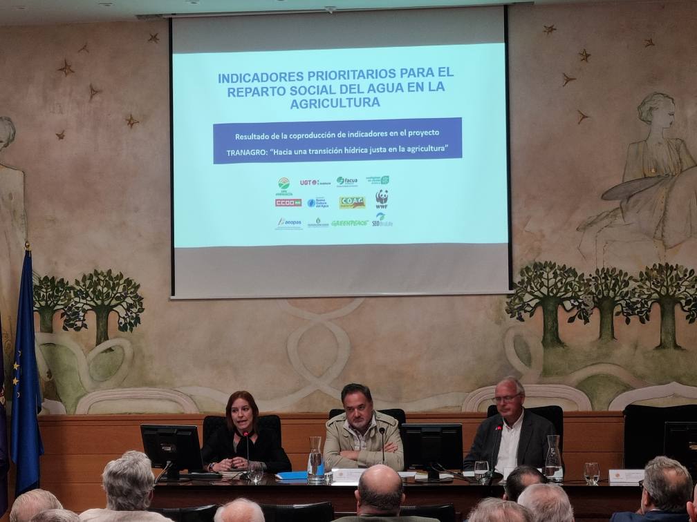 La primera mesa, promovida y coordinada por la “Mesa Social del Agua de Andalucía”, la introdujo y moderó Francisco Casero, presidente Fundación Savia. E incluyó las ponencias: La Mesa Social del Agua de Andalucía: origen, trayectoria y significación a cargo de Leandro del Moral. Miembro de la Fundación Nueva Cultura del Agua (FNCA); La transición hídrica justa en el sector agrario: propuesta de reparto social del agua con Noelia Márquez (COAG-Andalucía) y Roque García (vicesecretario general de Desarrollo Rural y Agua de UPA-Andalucía) y el Ensayo de aplicación al caso de los acuíferos sobreexplotados de Doñana a cargo de Joan Corominas, presidente de la Fundación Nueva Cultura del Agua (FNCA).